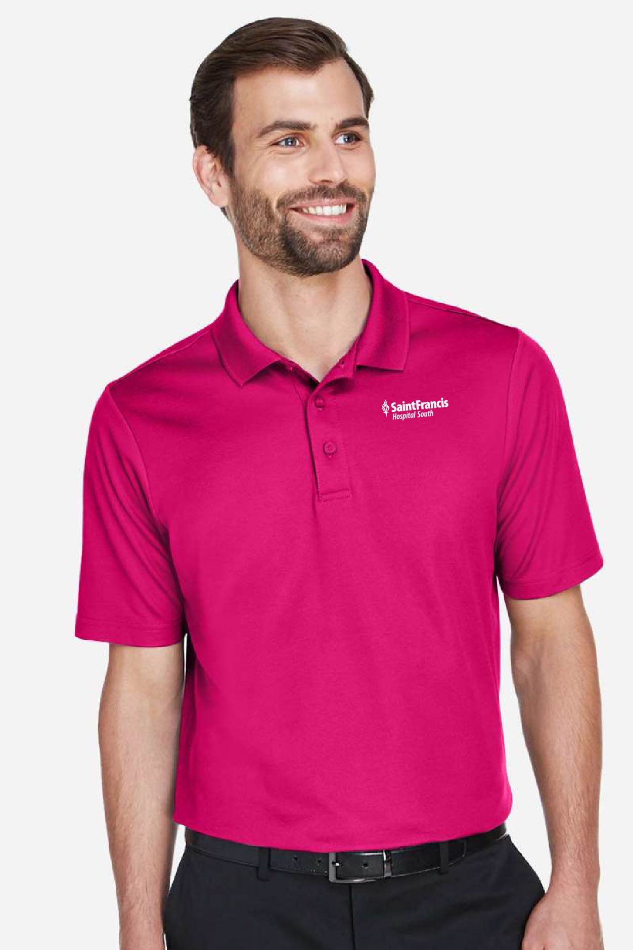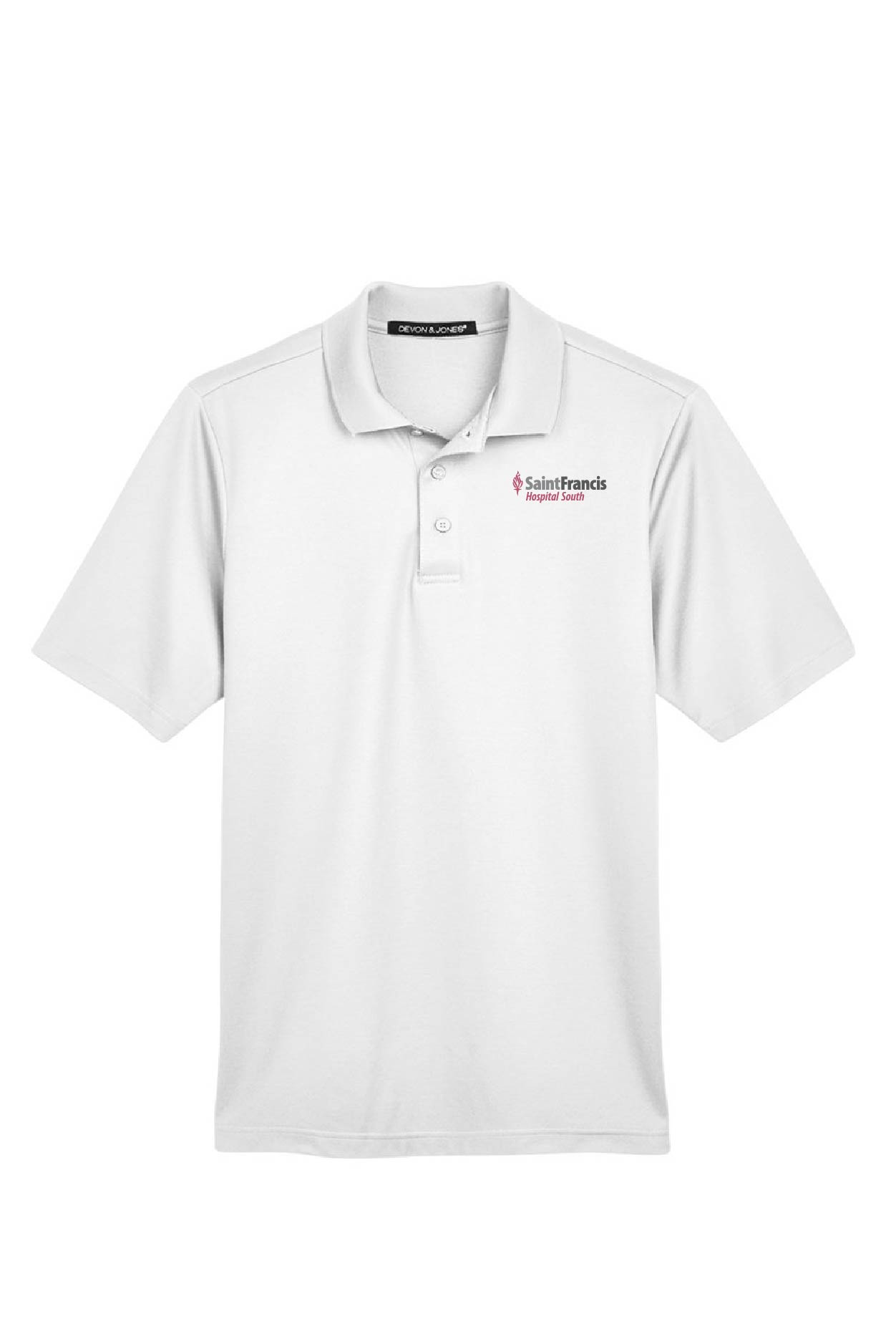5 oz./yd²./ 172 gsm (US), 8.4 oz/Lyd (CA), 100% polyester face plaited to 60/40 polyester/cotton back (total overall garment 61/39 polyester/cotton) Proprietary dual-sided mesh pique knit constructed of fine denier wicking polyester on the outside and soft-as-cotton wicking blend on the inside Moisture-management performance UPF 15-39 protection Matching flat-knit collar Luxury, comfort and performance in one Three-button placket Dyed-to-match buttons