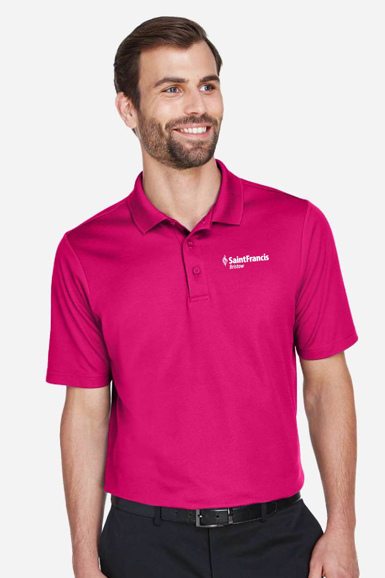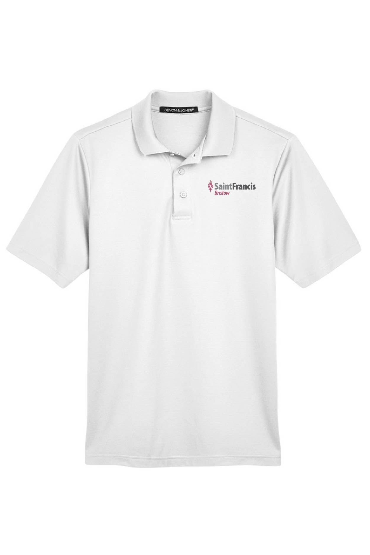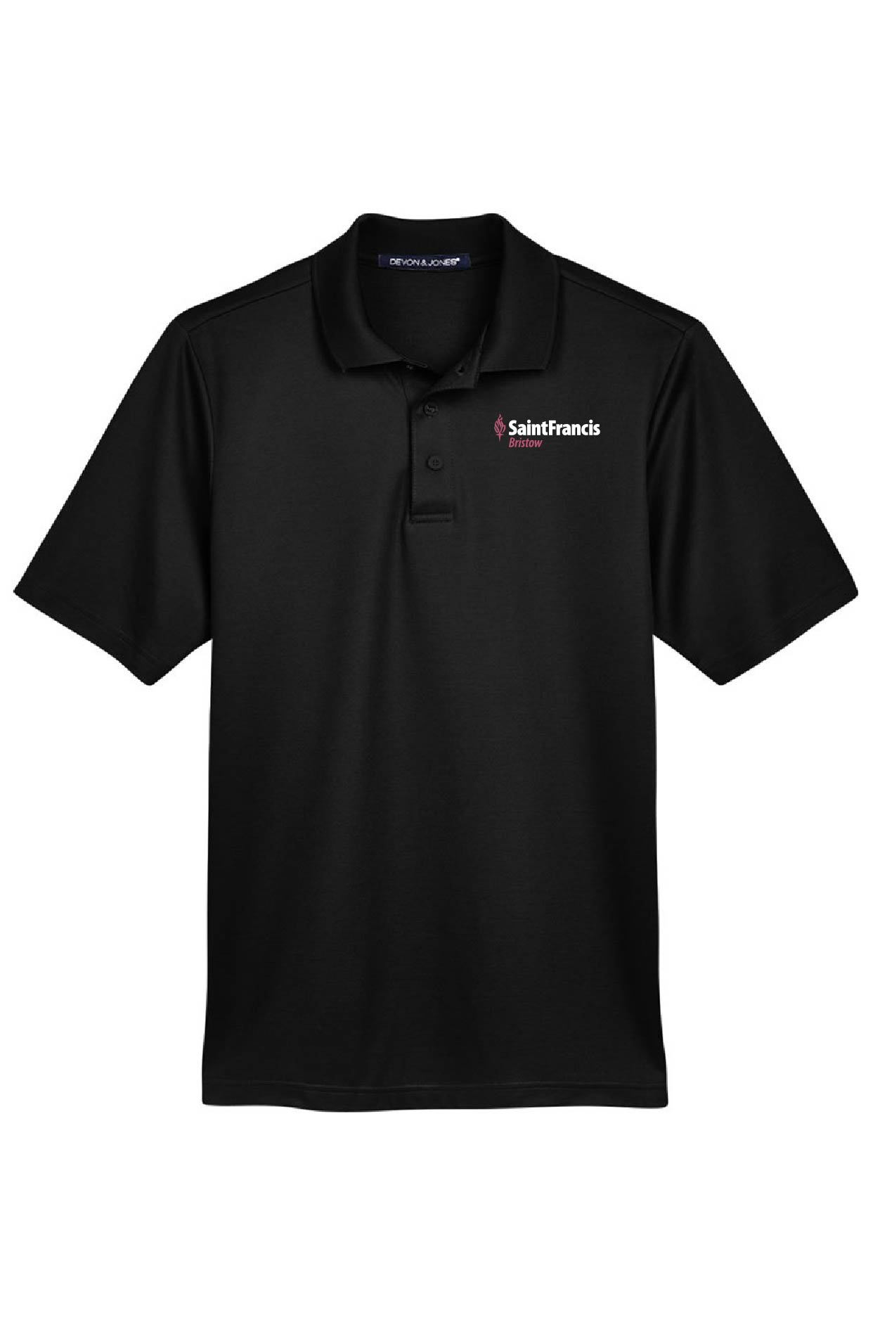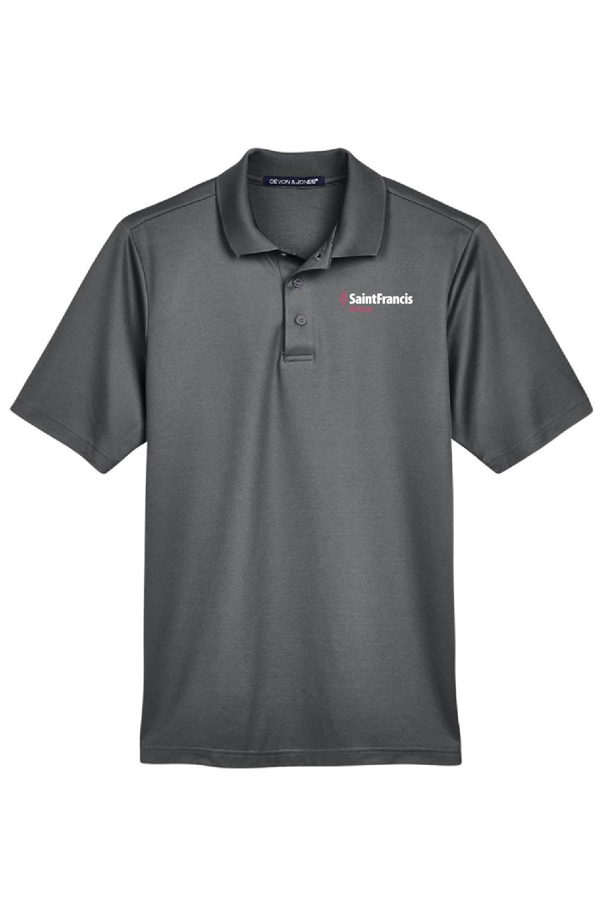 5 oz./yd²./ 172 gsm (US), 8.4 oz/Lyd (CA), 100% polyester face plaited to 60/40 polyester/cotton back (total overall garment 61/39 polyester/cotton) Proprietary dual-sided mesh pique knit constructed of fine denier wicking polyester on the outside and soft-as-cotton wicking blend on the inside Moisture-management performance UPF 15-39 protection Matching flat-knit collar Luxury, comfort and performance in one Three-button placket Dyed-to-match buttons