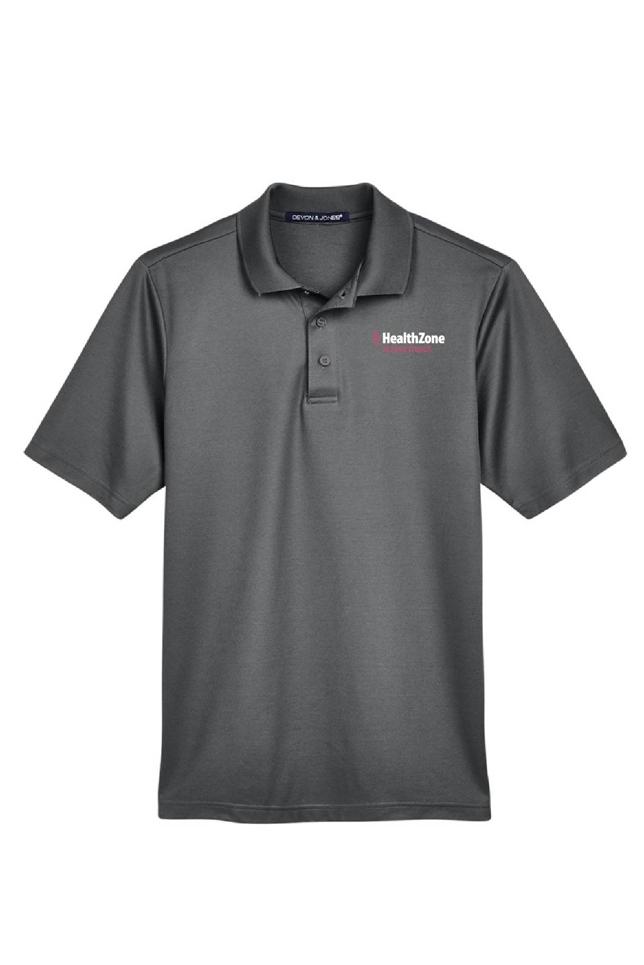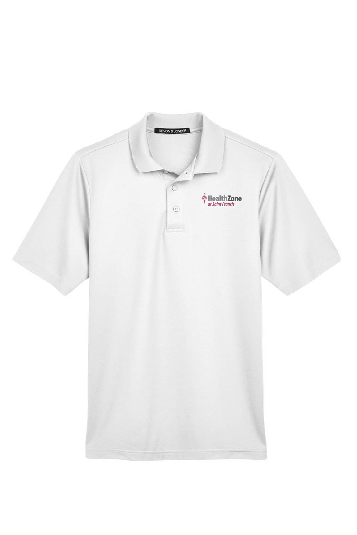 5 oz./yd²./ 172 gsm (US), 8.4 oz/Lyd (CA), 100% polyester face plaited to 60/40 polyester/cotton back (total overall garment 61/39 polyester/cotton) Proprietary dual-sided mesh pique knit constructed of fine denier wicking polyester on the outside and soft-as-cotton wicking blend on the inside Moisture-management performance UPF 15-39 protection Matching flat-knit collar Luxury, comfort and performance in one Three-button placket Dyed-to-match buttons
