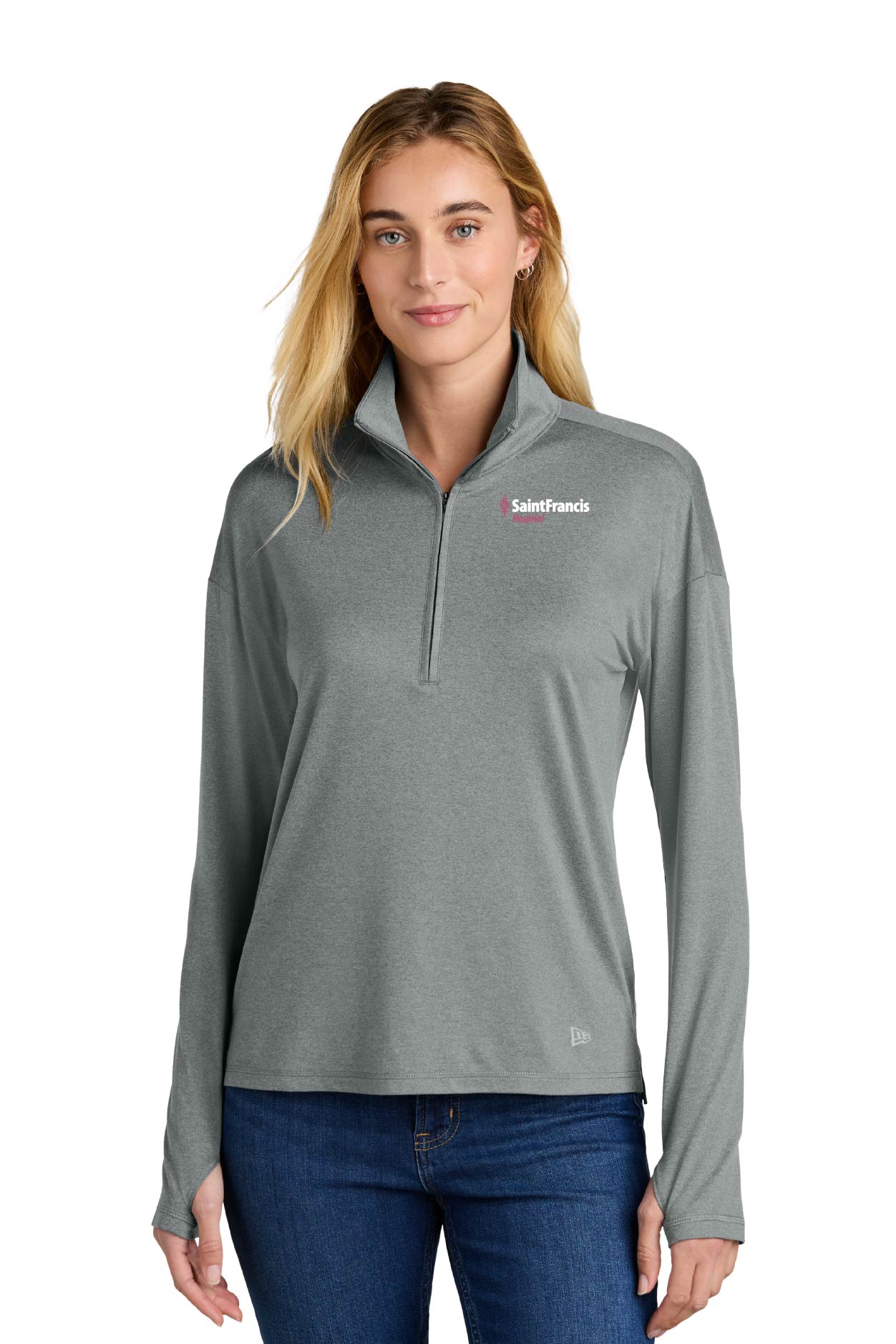 With moisture wicking and stretch, this 1/2-zip empowers your performance. 4.7-ounce, 91/9 polyester/spandex Inner neck locker loop Heat transfer label for tag-free comfort Invisible kissing welt zipper with gunmetal pull Thumbholes Reflective silver heat transfer New Era flag logo on left hem Slight drop tail hem
