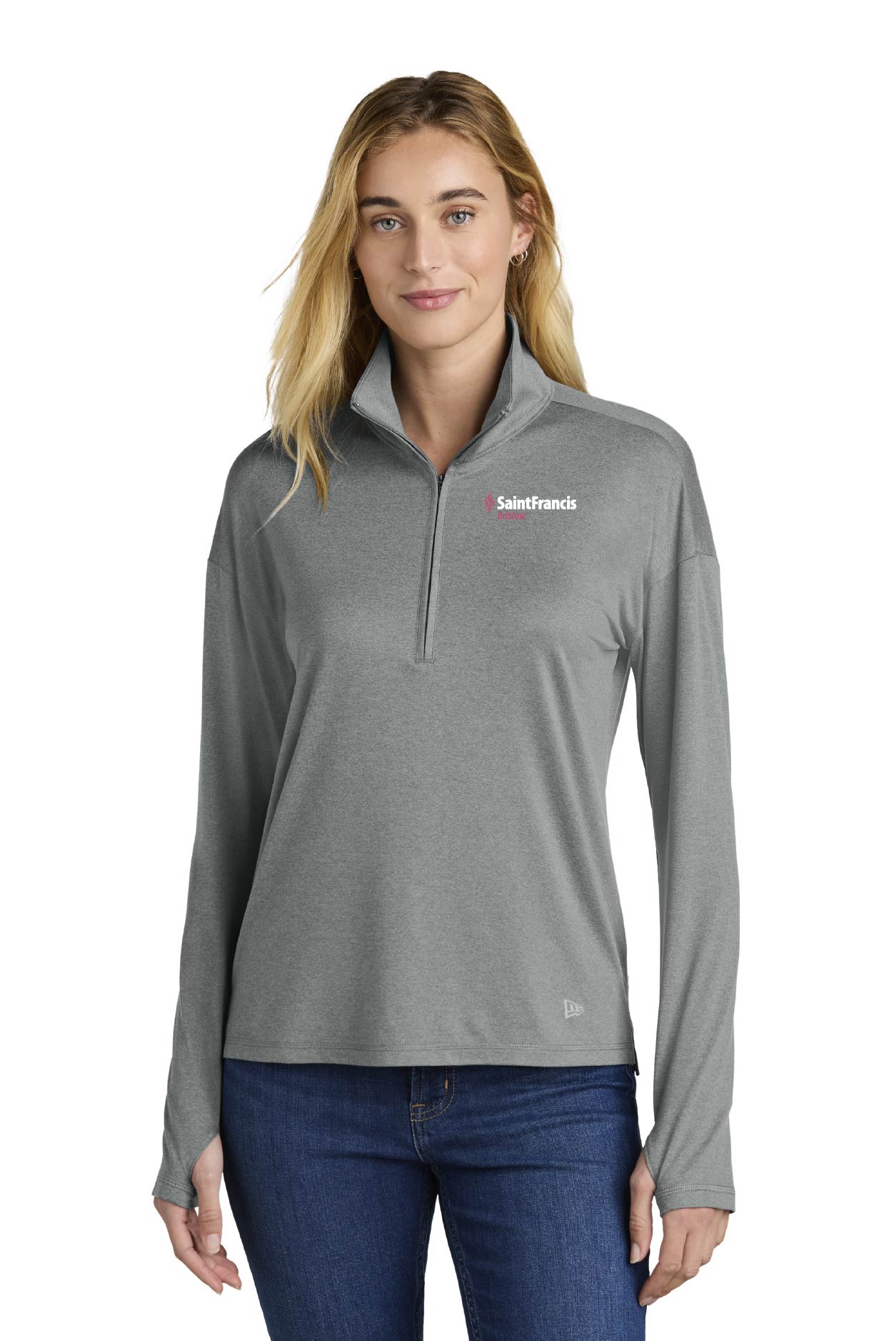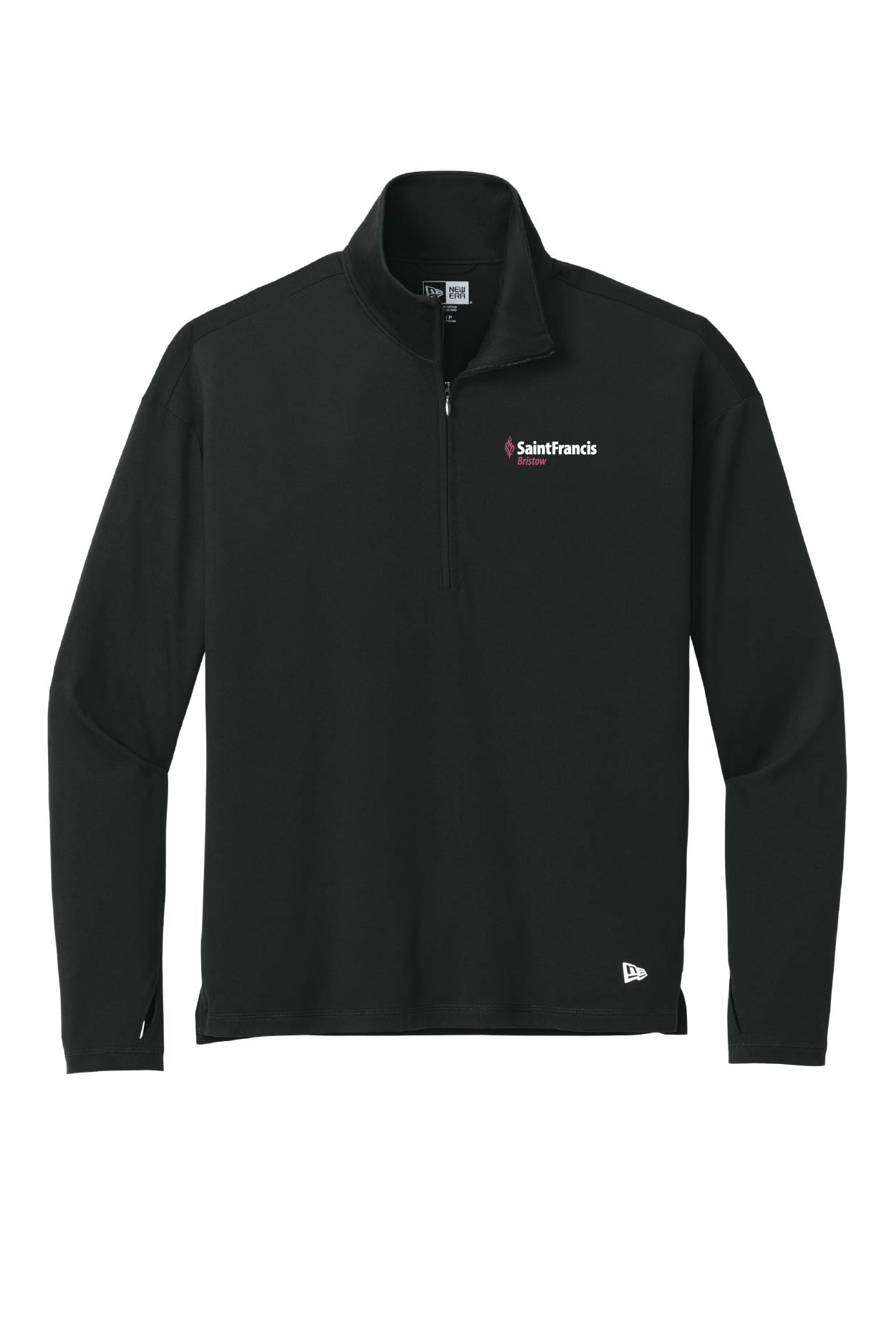 With moisture wicking and stretch, this 1/2-zip empowers your performance. 4.7-ounce, 91/9 polyester/spandex Inner neck locker loop Heat transfer label for tag-free comfort Invisible kissing welt zipper with gunmetal pull Thumbholes Reflective silver heat transfer New Era flag logo on left hem Slight drop tail hem