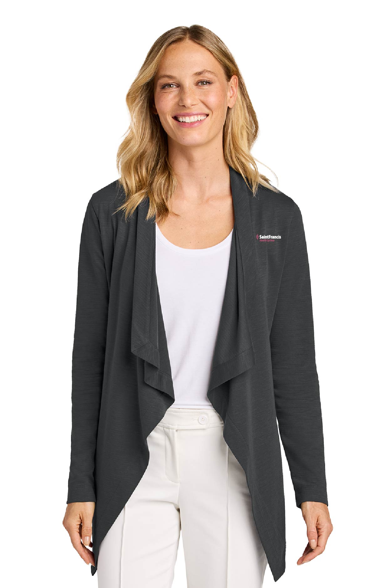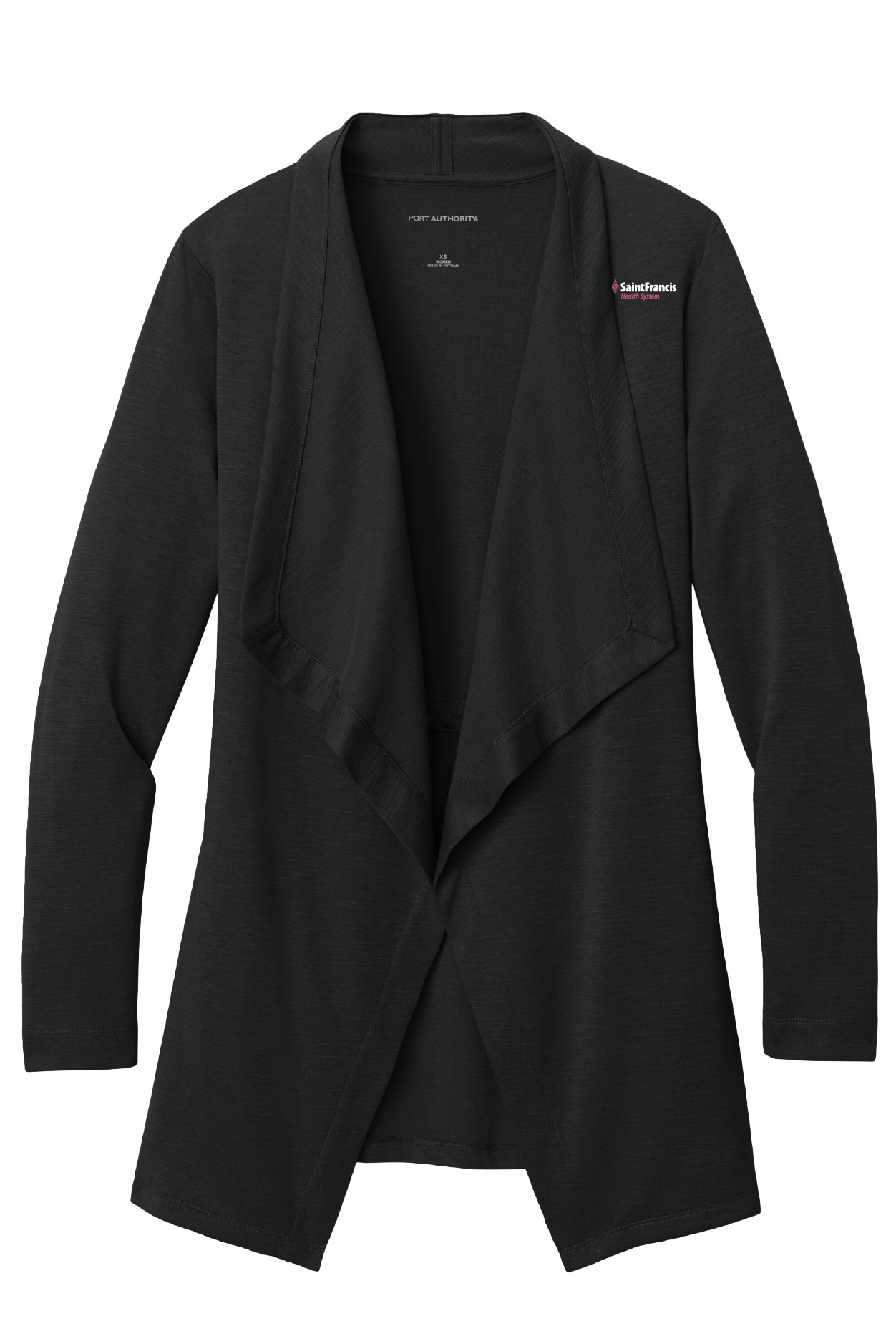 This crowd-pleasing cardigan, with its subtle slub texture, offers a carefree layering option for the office or any casual setting. 6.3-ounce, 60/40 cotton/polyester Open front Shawl collar with waterfall lapels Set-in sleeves Side seam pockets Elastic at back waist for subtle shaping Self-turned cuffs and hem
