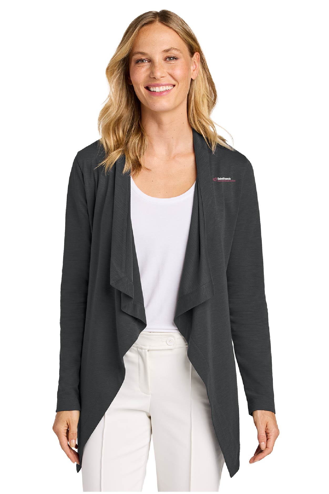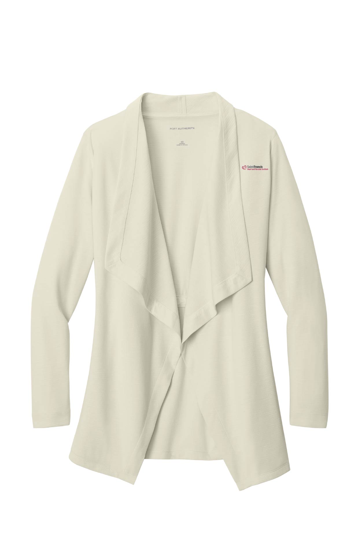 This crowd-pleasing cardigan, with its subtle slub texture, offers a carefree layering option for the office or any casual setting. 6.3-ounce, 60/40 cotton/polyester Open front Shawl collar with waterfall lapels Set-in sleeves Side seam pockets Elastic at back waist for subtle shaping Self-turned cuffs and hem