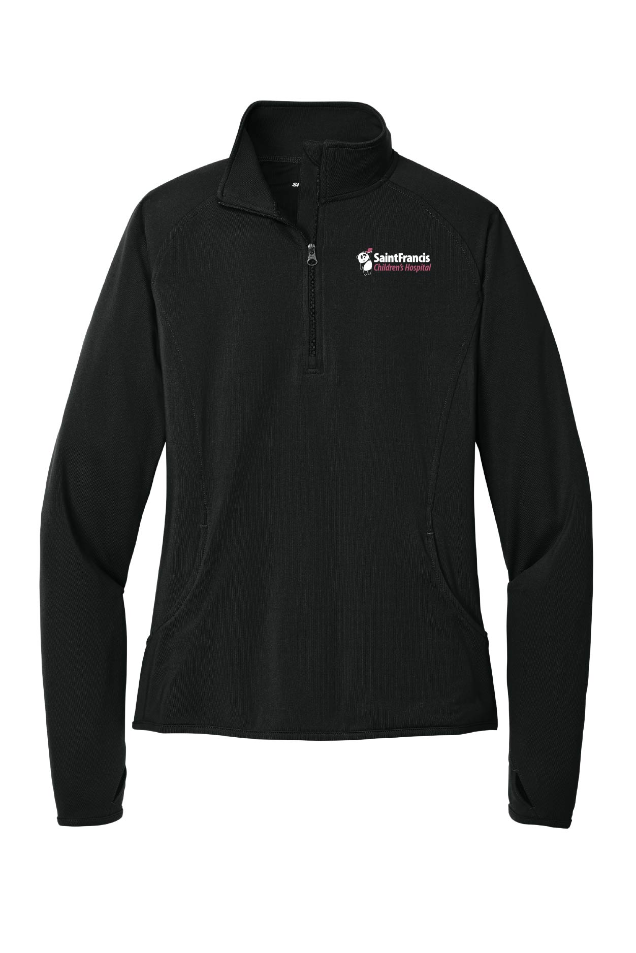 An extremely flexible layer with a soft-brushed backing and moisture control for year-round comfort. 6.8 oz., 90/10 polyester/spandex. Cadet collar with chin guard for additional comfort. Raglan sleeves and thumbholes to keep hands warm. Hidden front pouch pocket. Open cuffs and hem