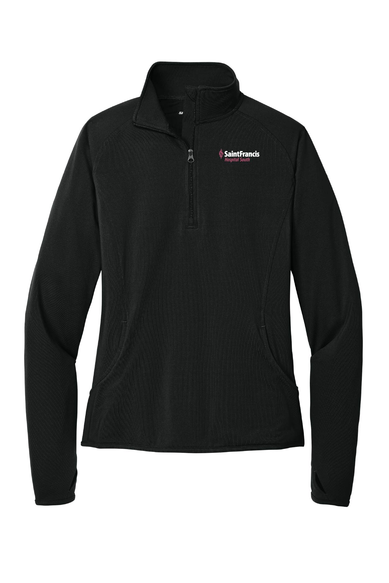 An extremely flexible layer with a soft-brushed backing and moisture control for year-round comfort. 6.8 oz., 90/10 polyester/spandex. Cadet collar with chin guard for additional comfort. Raglan sleeves and thumbholes to keep hands warm. Hidden front pouch pocket. Open cuffs and hem