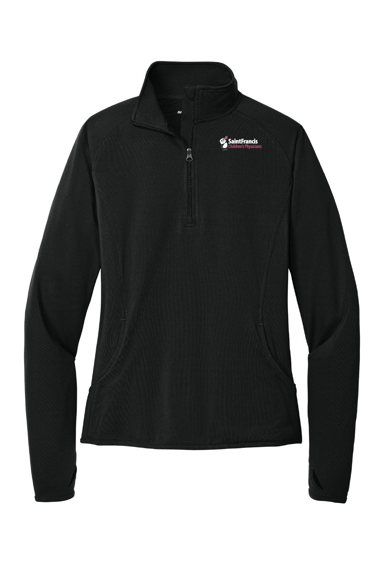 An extremely flexible layer with a soft-brushed backing and moisture control for year-round comfort. 6.8 oz., 90/10 polyester/spandex. Cadet collar with chin guard for additional comfort. Raglan sleeves and thumbholes to keep hands warm. Hidden front pouch pocket. Open cuffs and hem