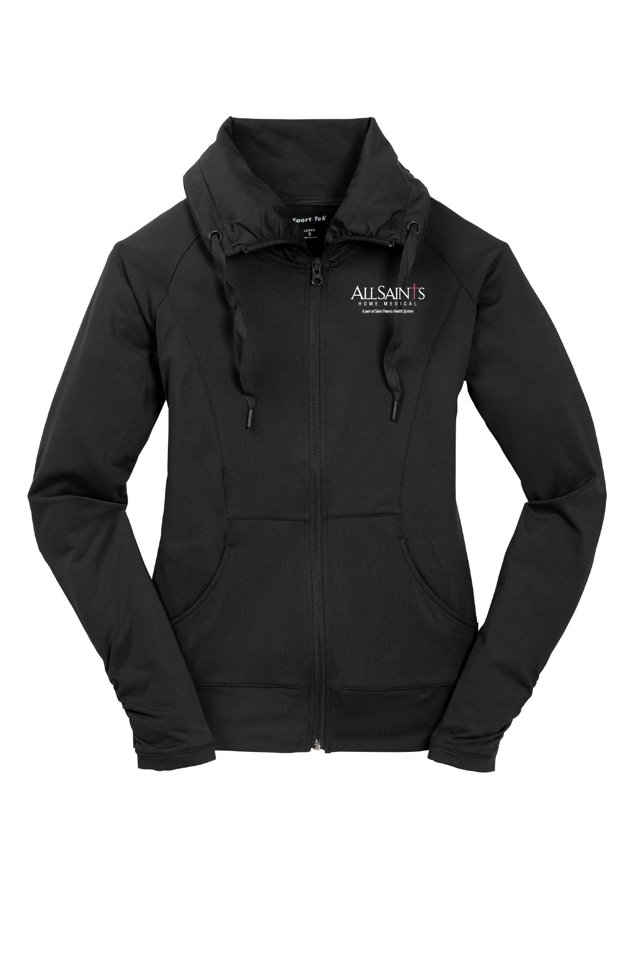 A stretchy, moisture-wicking performance jacket with a soft-brushed backing and unique cowl collar. 6.8 oz., 90/10 polyester/spandex jersey. Zip-through cowl collar with ruching. Front pouch pockets and open hem.